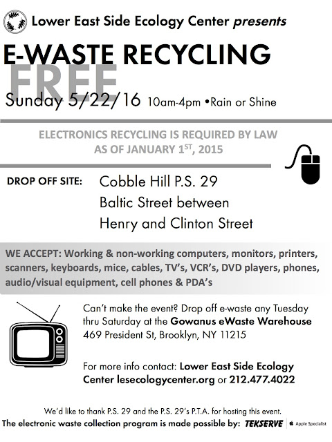 The Lower East Side Ecology Center is holding an e-waste drop off event this Sunday at P.S. 29 from 10am - 4pm. You can bring old phones, computers, batteries, light bulbs, and other defunct electronics for them to be recycled or properly disposed of through the Gowanus E-Waste Warehouse. Event details and flyer below: